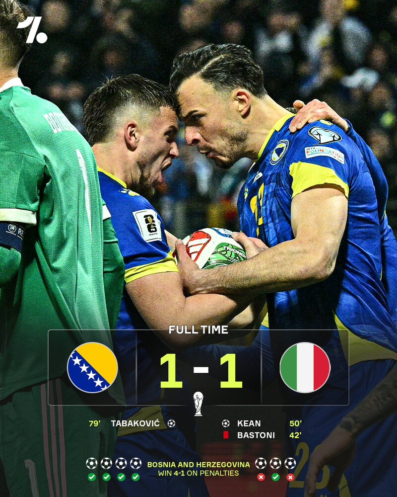 Tại đây, Bosnia & Herzegovina thể hiện bản lĩnh khi thực hiện thành công cả 4 lượt sút. Ngược lại, Italia lại mắc sai lầm nghiêm trọng khi Francesco Esposito và Bryan Cristante đều không thể chiến thắng thủ môn đối phương. Kết quả chung cuộc 1-4 trên chấm 11m đã chính thức khép lại giấc mơ World Cup của Azzurri.